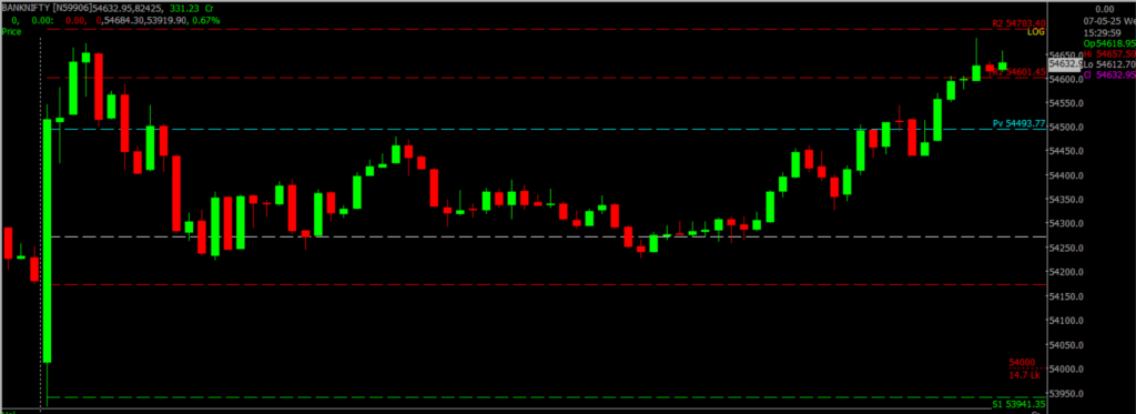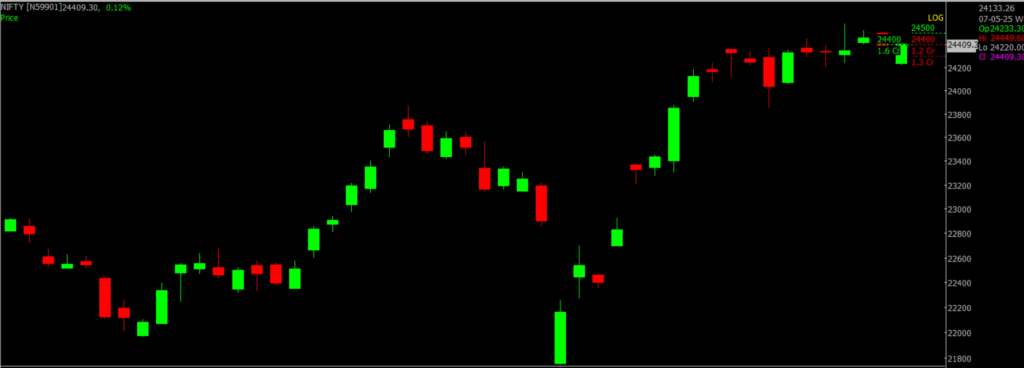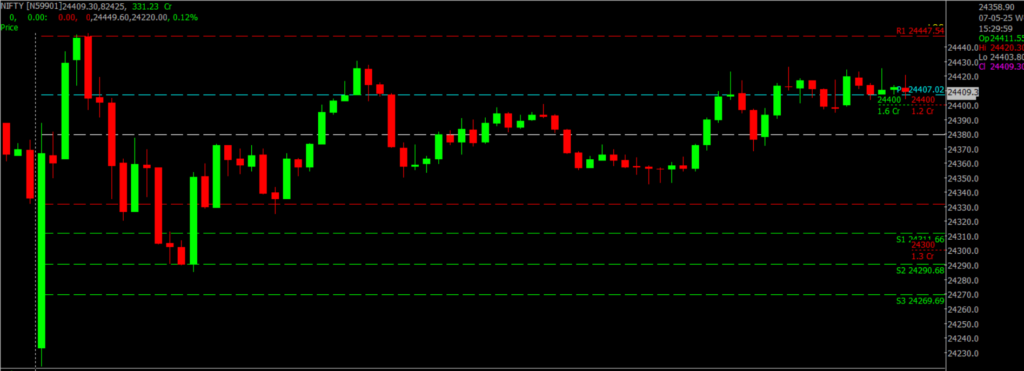 The Indian stock market ended slightly higher, with the Nifty 50 closing at 24,414.4 — up 34.8 points from the previous session. Despite experiencing volatility driven by geopolitical concerns following India’s targeted strikes on terror camps in Pakistan under “Operation Sindoor,” the market displayed strength and stability. A bullish candlestick pattern appeared near the day’s low on the daily chart, signaling buying interest during dips. Over the past 9 to 10 sessions, Nifty has moved within a broad range, showing a series of higher lows on the daily timeframe. Key resistance is expected around 24,500–25,000, while immediate support lies between 24,400 and 24,000.