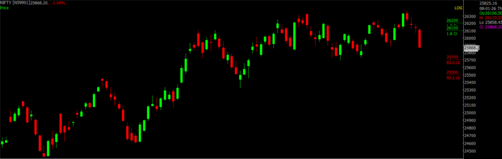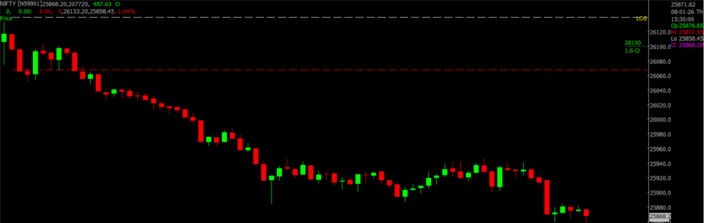 A rising India VIX further reflects growing nervousness among market participants. Overall, the technical setup appears unfavorable for bulls. Immediate resistance is seen in the 26,000–26,300 range, while support is placed between 25,900 and 25,700.