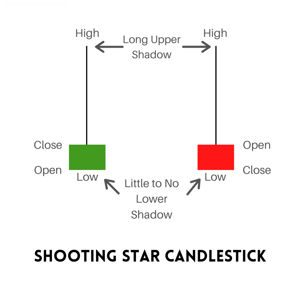 Shooting stars indicate a potential shift towards a downside movement and are particularly impactful when they follow 2-3 consecutive candles with higher highs. These stars typically open and rise with significant strength during the trading session, reflecting the persistent buying pressure observed in previous sessions.